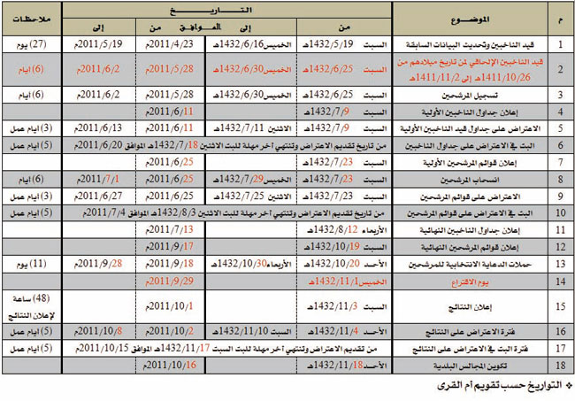 وأشار المهندس الزنيدي إلى أن استثناء قيد الناخبين لمن ميلادهم في هذا التاريخ يأتي نظرا لتأجيل يوم الاقتراع أسبوعا كاملا والذي كان مقررا يوم الخميس 24 /10 /1432 هـ، إلى يوم الخميس 1 /11 /1432 هـ وبالتالي أحقية هذه الفئة في قيد أسمائهم حسب لائحة الانتخابات.