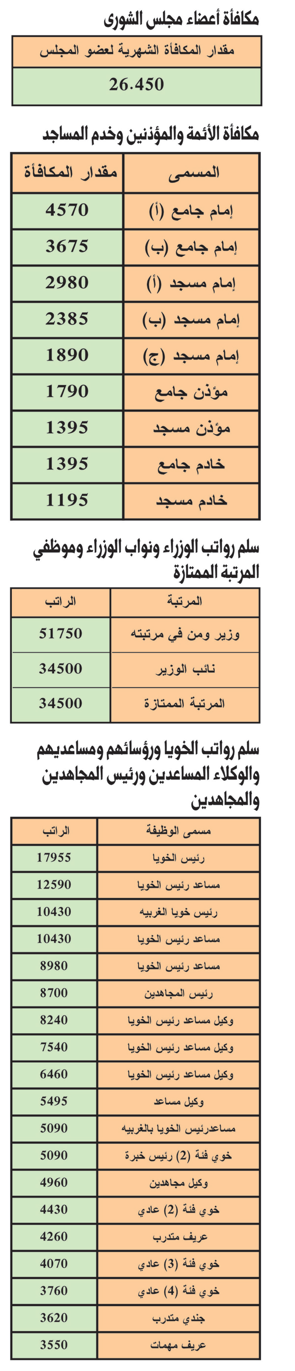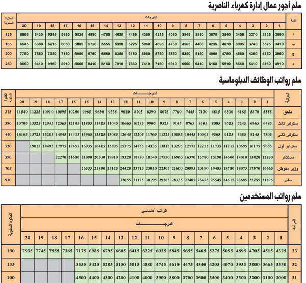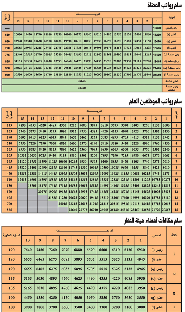 صدر أمر خادم الحرمين الشريفين -حفظه الله - رقم 4097-م ب وتاريخ 25-6-1432هـ باعتماد عدد (18) سلماً وجدولاً لرواتب الموظفين المدنيين العاملين في الدولة والذي جاء تعديلها بناء على الأمرين الملكيين الكريمين رقم (أ-23) وتاريخ 20-3-1432هـ القاضي بتثبـــيت بدل غلاء المعيشة ومقداره (15%) ضمن الراتب الأساسي، ورقم (أ-62) وتاريخ 13-4-1432هـ القاضي باعتماد الحد الأدنى لرواتب كافة فئات العاملين في الدولة من السعوديين بثلاثة آلاف ريال شهريا، وقضى الأمر الكريم بالعمل بهذه الســــلالم اعتبارا من 25-6-1432هـ.