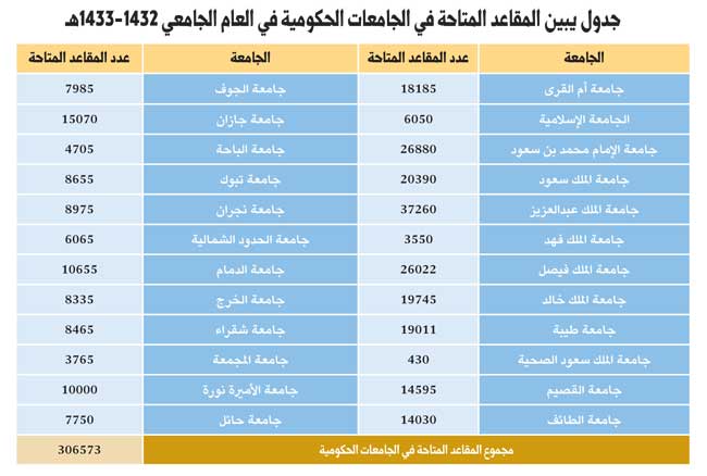 أوضح ذلك معالي وزير التعليم العالي د. خالد بن محمد العنقري وقال إن الوزارة بالتنسيق مع الجامعات أكملت استعداداتها لقبول أكثر من (306) آلاف طالب وطالبة في العام الجامعي 1432-1433هـ، وذلك في مسارات الالتحاق الدراسية الثلاثة «الانتظام والانتساب والتعليم الموازي»، وهو ما يعني أن الجامعات الحكومية مهيأة لاستيعاب جميع من تنطبق عليهم معايير القبول من الطلاب والطالبات السعوديين المتوقع تخرجهم في المرحلة الثانوية لهذا العام، بالإضافة إلى الجامعات والكليات الأهلية، والمقدَّر أن توفر جميعها ما يقارب (15000) مقعد إضافي.