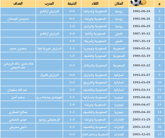 واللاعبون السعوديون الذين سجلوا في نهائيات كأس العالم محيسن الجمعان وسعدون حمود وخالد منسي وخالد الرويحي - رحمه الله - وحمد الدبيخي وعبد الله سليمان ومحمد أمين وصالح الصقري وعيسى المحياني وناجي مجرشي.