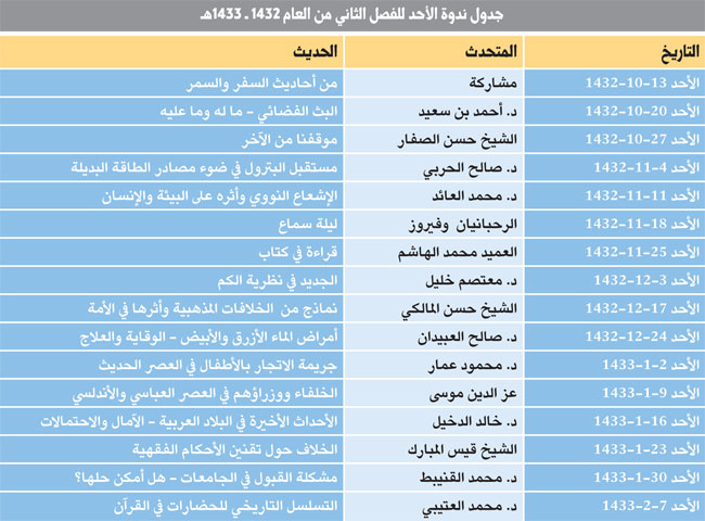 تنطلق يوم الأحد القادم 13-10-1432هـ ندوة الأحد التي ينظمها الدكتور راشد المبارك كل أحد وعلى امتداد 33 عاماً حيث تضمن جدول الفصل الثاني من العام 1432-1433هـ العديد من الفعاليات في مختلف الجوانب الثقافية والفكرية والقضايا التي تهم المجتمع حيث ستكون باكورة الفعاليات مشاركة بعنوان من أحاديث السفر والسمر وفقاً للجدول الذي ننشره مرفقا بخبرنا هذا.