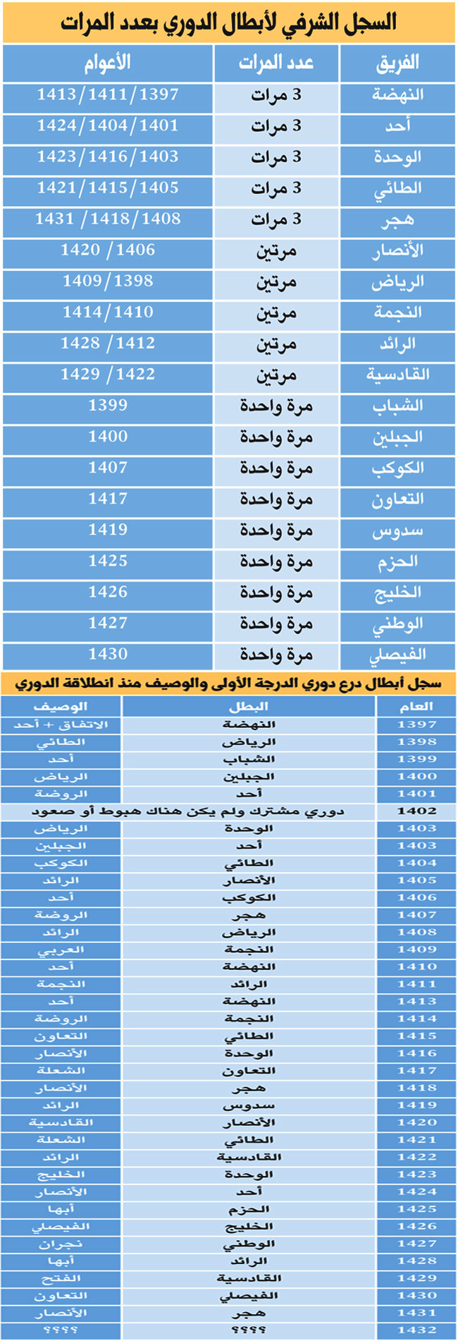 * فريق هجر خطف الأولوية والرقم القياسي في تحقيق أكبر عدد من النقاط حين جمع 63 نقطة كأعلى رصيد نقطي يسجله فريق في الدرجة الأولى في العام الماضي ليكسر الرقم المسجل باسم الفيصلي بـ58 نقطة.