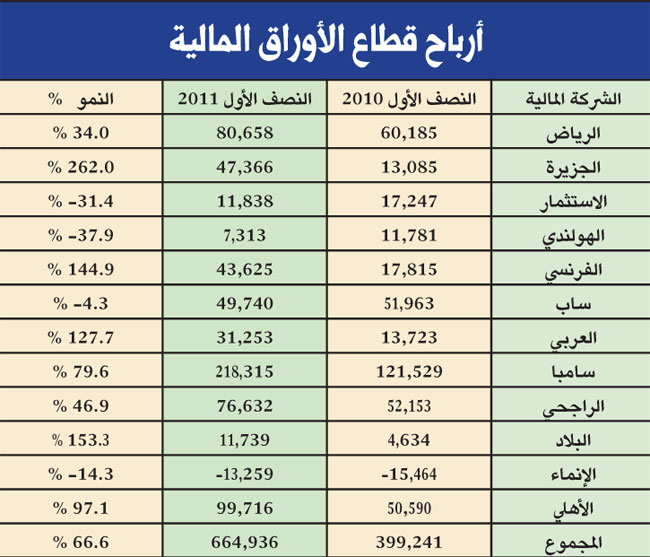 أصدرت إدارة الأبحاث والمشورة التابعة لشركة البلاد للاستثمارمؤخرا تقريرعن قطاع أعمال الأوراق المالية للنصف الأول 2011 بهدف بيان معدل نمو أرباح قطاع الأوراق المالية وأثر ذلك على أرباح المصارف السعودية عبر دراسة عينة رئيسية من شركات القطاع تمثل الشركات المالية التابعة للمصارف السعودية وعددها اثنا عشرة شركة مرخصة بممارسة أعمال الأوراق المالية، وبلغت أرباح شركات أعمال الأوراق المالية التابعة للمصارف السعودية خلال النصف الأول من العام الحالي 664.9 مليون ريال مرتفعة بمقدار 66 % عن أرباح النصف الأول من العام الماضي والذي بلغت فيه 399.2 مليون ريال. وذكر التقرير أن أعلى معدل نمو حققته شركة الجزيرة المالية حيث نمت أرباحها 262 % مقارنة بالعام الماضي، يليها شركة البلاد للإستثمار حيث نمت أرباحها 153 % مقارنة بنفس الفترة من العام الماضي ثم الفرنسي كابيتال 144 % يليه العربي الوطني للإستثمار 127 % فشركة الأهلي المالية 97 % ثم سامبا كابيتال 79 % فشركة الراجحي المالية 46.9 % ويليها الرياض المالية بمعدل نمو 34 %.