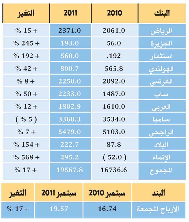 سجّلت البنوك السعودية المدرجة بالسوق المالي خلال الأشهر التسعة الأولى من 2011 ارتفاعاً في أرباحها المجمعة بنسبة 17% إلى 19.57 مليار ريال، مقارنة بالفترة المماثلة من عام 2010 التي حققت خلالها أرباحاً قاربت الـ 17 مليار ريال. ووفقاً لـ»أرقام» لا تتضمن هذه الأرقام أرباح البنك الأهلي - أكبر البنوك السعودية - أو الفروع الأجنبية العاملة في المملكة.