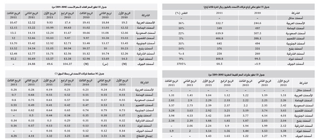 بداية يعتبر قطاع الأسمنت من القطاعات التي خرجت جميع أسمهما رابحة في الثلاثة أرباع المنتهية من عام 2011م. كما أنه باستثناء أسمنت الشرقية، فإن كافة شركات القطاع أحرزت نموا إيجابيا في صافي أرباحها للفترة المنتهية من 2011م مقارنة بمثيلتها من العام السابق، وقد استطاع سهم أسمنت الجنوبية تحقيق أعلى ربح بمقدار 645 مليون ريال في التسعة أشهر الأولى من عام 2011، وبمعدل نمو مقداره 31% مقارنة بالفترة المماثلة من العام السابق 2010، يليه في المرتبة الثانية أسمنت السعودية، بصافي أرباح بلغت 619.9 مليون ريال، وبمعدل نمو 22% أما أسمنت اليمامة فقد بلغ صافي أرباحه 549 مليون ريال، وبمعدل نمو بلغت نسبته 10% خلال الأشهر التسع المنصرمة من عام 2011م، ومن الملفت للانتباه، ما أحرزه سهم أسمنت الجوف من أعلى نمو في الأرباح، فقد تحول من الخسارة بقيمة 1.9 مليون، إلى ربح مقداره 68.5 مليون ريال في عام 2011م وبمعدل نمو بلغ 3705%.