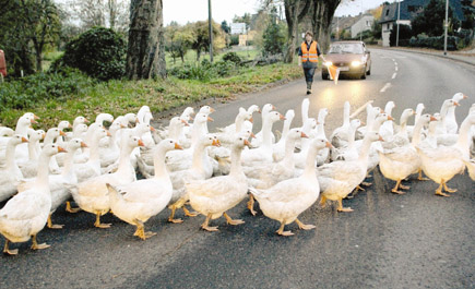 سرب من طائر الأوز يعبر شارعاً فرعياً بمساعدة إحدى سيدات الأمن؛ للانتقال لإحدى مزارع الأوز المشهورة في ألمانيا. ويُعتبر هذا الطائر وجبة طعام شهية تقدر قيمة الكيلوجرام من لحمها بـ63 ريالاً. الفرنسية...>>>...