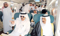 تفقد معالي وزير النقل رئيس مجلس إدارة المؤسسة العامة للخطوط الحديدية الدكتور جبارة بن عيد الصريصري أمس أحد القطارات الجديدة بمحطة الركاب بالدمام والتي وصلت المملكة مؤخراً في إطار اتفاقية وقعتها المؤسسة مع شركة كاف الأسبانية بقيمة (612) مليون ريال لتوريد ثمانية أطقم قطارات جديدة>>
