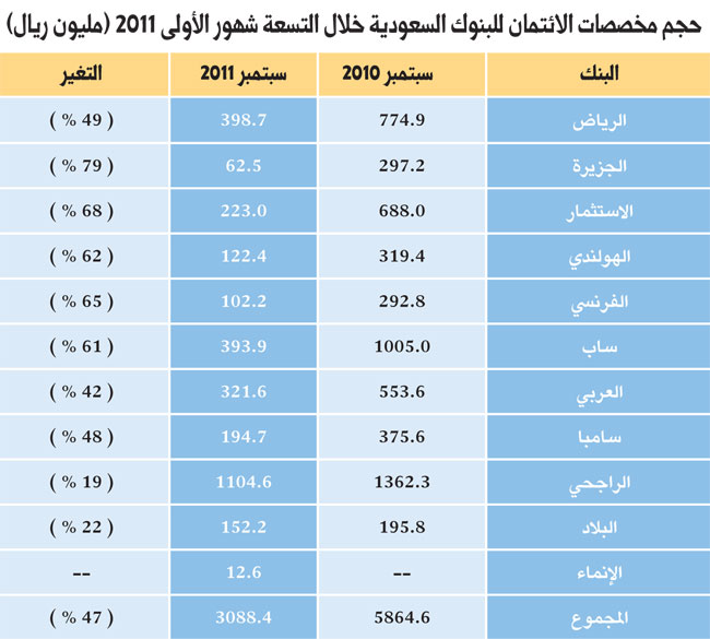 وعلى صعيد نتائج البنوك فقد حققت الأرباح المجمعة للبنوك السعودية المدرجة قبل احتساب المخصصات خلال التسعة أشهر الأولى من 2011 استقراراً مقارنة بالفترة المقابلة من العام السابق، ويعود السبب في ذلك إلى تراجع دخل البنوك من العمليات الخاصة مع تراجع معدلات الفائدة. والجدول يوضح صافي أرباح البنوك قبل احتساب قيمة المخصصات.