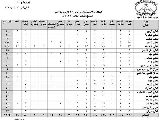 - (23.317) وظيفة تم تخصيصها للتعليم العام بزيادة بلغت (2.317) تمثل الوظائف المتبقية التي تعذر شغلها خلال الإعلان الماضي.