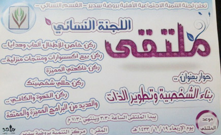 أقامت اللجنة النسائية بلجنة التنمية الاجتماعية الأهلية بروضة سدير الملتقى النسائي الاجتماعي، بعنوان (بناء الشخصية وتطوير الذات). وقد تضمَّن هذا الملتقى عدداً من البرامج والأنشطة، كان من أهمها: إقامة محاضرة اجتماعية بعنوان (كيف تطورين ذاتك)، وأهم النقاط المفيدة في إثبات الشخصية والثقة بالنفس، مع توزيع...>>>...