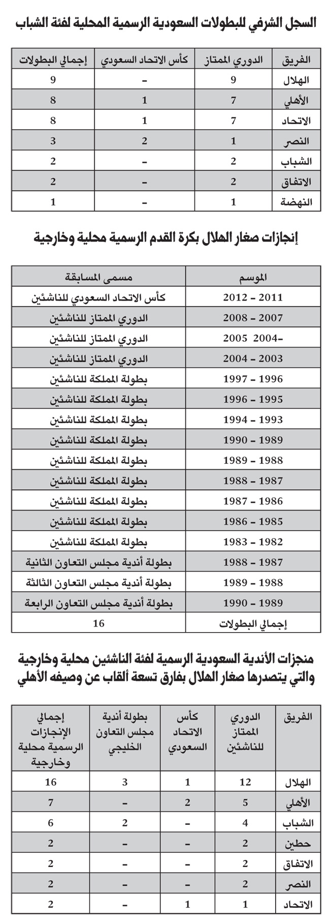 اللاعب الهلالي يتشرّب نهم التوشح بالبطولات منذ الصغر عبارة تؤكّدها الإحصاءات والأرقام، فكما للكبار 52 بطولة محلية وخارجية معتمدة رسمياً منحت نادي القرن صدارة الأندية السعودية الأكثر إنجازاً وعلى بعد 20 لقباً عن وصيفه الاتحاد فلشباب الهلال 9 بطولات للدوري الممتاز منحتهم الأفضلية وصدارة الأكثر تحقيق للألقاب على مستوى الشباب بفارق لقب عن الجارين الاتحاد والأهلي، للصغار أيضاً نصيبهم من الزعامة على نهج شبابهم وكبارهم.