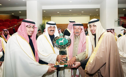 تغطية - عايض البقمي : نيابة عن صاحب السمو الملكي الأمير نايف بن عبدالعزيز ولي العهد نائب رئيس مجلس الوزراء وزير الداخلية توج أمير منطقة الرياض بالنيابة الأمير محمد بن سعد بن عبدالعزيز الأمير متعب بن عبدالله عقب نهاية الشوط السابع، والذي حسمه الجواد صيرور من الأسطبل الأبيض، وبعد أداء رائع