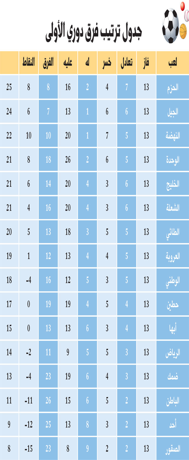 - الفارق ليس بالبعيد بين الحزم المتصدر وحطين صاحب المركز العاشر مما يؤكد بأن المنافسة هذا العام ستكون مثيرة وحامية الوطيس فالحزم بـ 25 نقطة أولاً وحطين بـ 17 نقطة في المركز العاشر، والفارق 8 نقاط من السهولة كسره في جولتين.