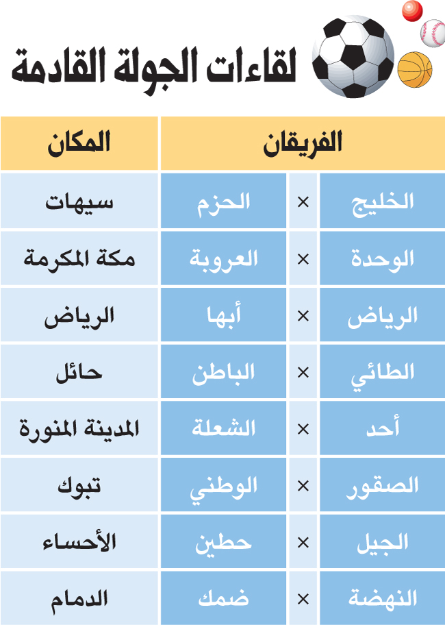ـ الجولة القادمة ستكون أكثر إثارة وندية وستتضح معها بعض ملامح المنافسة بلقاءات قوية أبرزها لقاء الخليج والحزم ولقاء الوحدة مع العروبة.