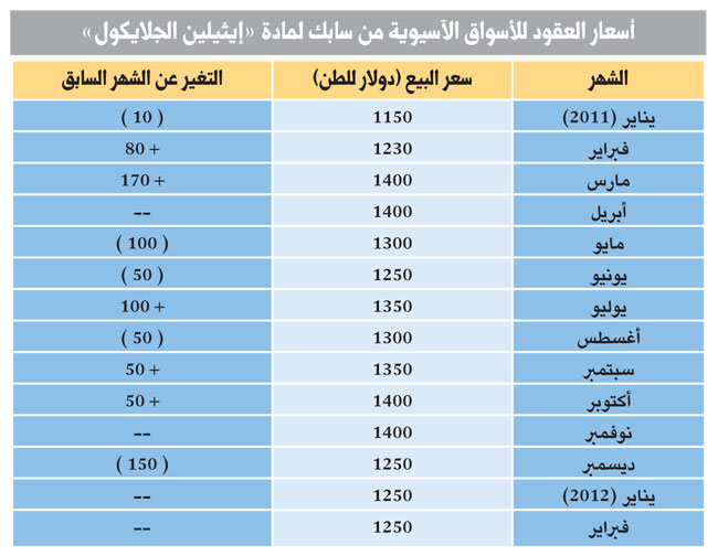 وقامت شركة ميجلوبل برفع أسعارها المقترحة لعقود بيع مادة الـ MEG في الأسواق الآسيوية لشهر فبراير المقبل بمقدار 30 دولاراً عند 1240 دولارا للطن، مقارنة بمستوى عقود شهر يناير الحالي.