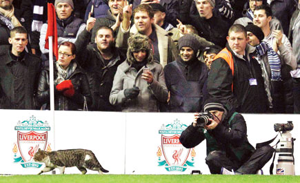 لندن - (رويترز): نالت قطة اقتحمت ملعب انفيلد الشهير لثلاث دقائق خلال مباراة تعادل فيها ليفربول سلبيا مع توتنهام في الدوري الإنجليزي الممتاز لكرة القدم الاثنين شهرة واسعة على الإنترنت. وتبارت عدة صفحات على موقع تويتر للتواصل الاجتماعي في نشر لقطات للقطة وادعى صاحب كل صفحة أنه أول من أذاع