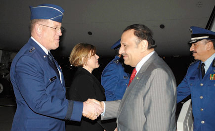 الجزيرة - عوض القحطاني وصل صاحب السمو الملكي الأمير خالد بن سلطان بن عبدالعزيز نائب وزير الدفاع والوفد المرافق له أمس إلى قاعدة نيليس الجوية بولاية نيفادا الأمريكية، لحضور ومتابعة مشاركة القوات الجوية الملكية السعودية في تمرين العلم الأحمر - 5 والعلم الأخضر - 2 مع القوات الجوية الأمريكية