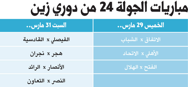 يدخل دوري زين السعودي لكرة القدم مساء اليوم الخميس مرحلة الحسم على لقب الدوري التي ستبلغ ذروتها خلال هذه الجولة بإقامة ثلاثة لقاءات ضمن الجولة الـ25 من عمر الدوري الذي بات في وضع مثير بكافة تفاصيله، واحتدمت المنافسة بشكل مثير بالمطاردة الثنائية بين الشباب والأهلي لحسم صدارة الدوري قبل لقاء الجولة الأخيرة الذي سيجمعهما سوياً في جدة، ويترقب الهلال أي تعثر ليلحق بفرصته في الحفاظ على لقبه، وكانت فرق الصدارة الشباب والأهلي والهلال قد حققت الفوز في الجولة الماضية ليتمسك كل فريق بمركزه، فالشباب سيرحل لمواجهة الاتفاق في الدمام على أن يلتقي الأهلي بغريمه التقليدي الاتحاد في جدة، بينما يحل الهلال ضيفاً على الفتح في الأحساء.