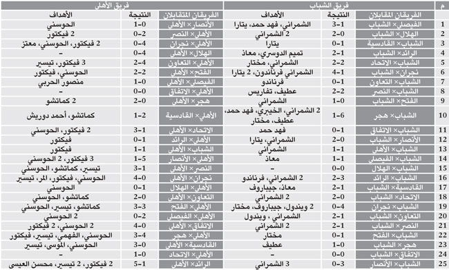 واصل فريق الشباب الاحتفاظ بسجله خالياً من الخسائر حتى نهاية الجولة الـ25 من وسجل مهاجموه بقيادة الشمراني 49 هدفاً ودخل مرماه 15 هدفاً موصلاً رصيده إلى 63 نقطة.. أما الأهلي فقد لعب 25 مباراة فاز في 19 متساوياً مع الشباب في عدد مرات الفوز وتعادل في 4 مباريات وخسر مباراتين، وسجل مهاجموه 59 هدفاً وعليه 21 هدفاً، وله من النقاط 61 نقطة. وفي ظل منافسة الفريقين على لقب الدوري، حيث يلعب الشباب بفرصتين التعادل والفوز، والأهلي بفرصة واحدة هي الفوز للحصول على لقب الدوري فإن المنافسة الأخرى تأتي على لقب هداف الدوري الذي يتصدره البرازيلي الأهلاوي فيكتور سيموس برصيد 21 هدفاً ومتقدماً بهدف واحد على ناصر الشمراني برصيد 20 هدفاً.