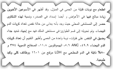 يعاني إبراهيم سليمان زقماط «فلسطيني من مواليد المملكة» من مرض السرطان.. وتم نقله إلى مدينة الملك فهد الطبية بالرياض وتم علاجه وبالكشف عليه في هذه المدينة. وقد أثبتت التقارير الطبية بأن المريض يعاني من أعراض ووجد بأنه يعاني من حالة نقص تعداد كرويات الدم البيضاء وضيف في التنفس على فترات