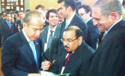 الجزيرة - عبدالله المقحم: استقبل الرئيس المكسيكي فيليبي كالديرون، مدير عام صندوق المئوية الدكتور عبد العزيز المطيري ورواد الأعمال من السعودية الذين شاركوا بقمة قادة رواد الأعمال لمجموعة دول العشرين، التي تستضيفها المكسيك. وقد أعطى مدير صندوق المئوية الرئيس نبذة عن الدور الذي يقوم به سيدى