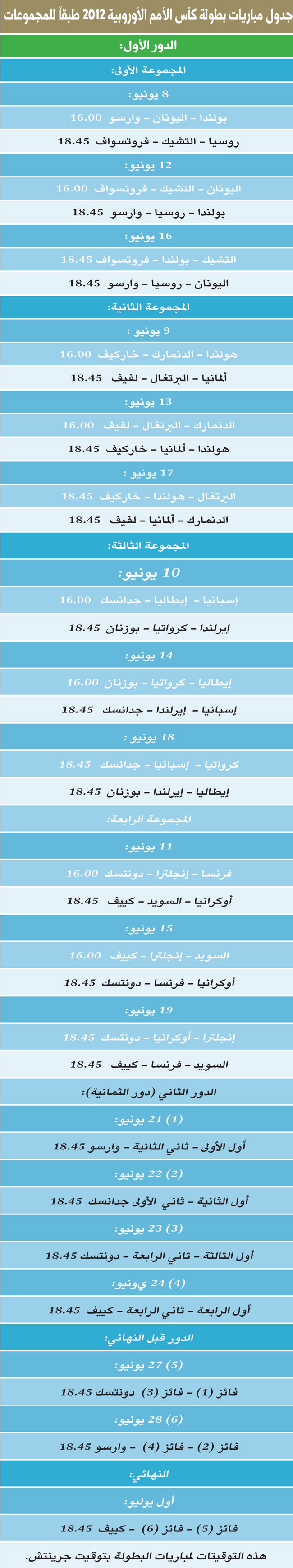 جدول مباريات بطولة كأس الأمم الاوربية 2012 طبقا للمجموعات