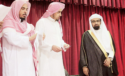 المجمعة - صالح الدهش : عقد الشيخ القارئ ناصر القطامي، لقاء مفتوحاً مع طلاب ومدرسي ومنسوبي جمعية تحفيظ القرآن الكريم بمحافظة المجمعة، وكان في استقبال القطامي، مدير عام الجمعية الأستاذ إبراهيم العقيل، ومدير الشؤون التعليمية بالجمعية الأستاذ بدر الخيال ، حيث تم تكريم الطلاب الفائزين بمسابقة