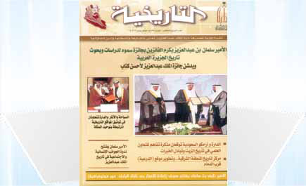 صدر العدد الجديد من (التاريخية)، وهي نشرة دورية تصدرها دارة الملك عبد العزيز. وتضمن العدد تكريم الأمير سلمان بن عبد العزيز الفائزين بجائزة سموه لدراسات وبحوث تاريخ الجزيرة العربية، وتدشين جائزة الملك عبد العزيز لأحسن كتاب. - السياحة والآثار والدارة تتعاونان في توثيق المواقع التاريخية المرتبطة