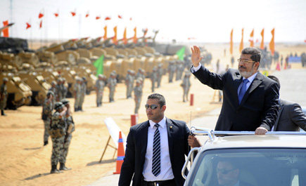 - الرئيس المصري محمد مرسي يُحيّي الجنود أثناء زيارتِه إلى الفرقة المدرّعةِ السادسةِ للجيشِ الثاني، قُرْب محافظة الإسماعيلية ... رويترز *** - غزة: برنامج العون والأمل لرعاية مرضى السرطان يعلن في غزة عن تحطيم الرقم القياسي بأطول شعار توعوي بالعالم باللون الوردي، طوله 1247 متراً