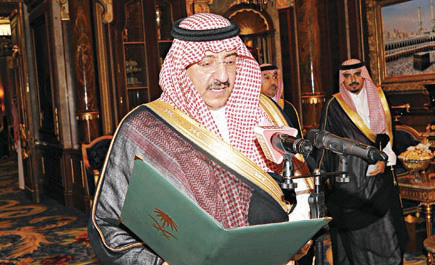 جدة - واس: تشرّف بأداء القسم أمام خادم الحرمين الشريفين الملك عبدالله بن عبدالعزيز آل سعود -حفظه الله- في قصره بجدة أمس صاحب السمو الملكي الأمير محمد بن نايف بن عبدالعزيز بمناسبة صدور الأمر الملكي الكريم بتعيين سموه وزيراً للداخلية قائلاً: (بسم الله الرحمن الرحيم، أقسم بالله العظيم أن