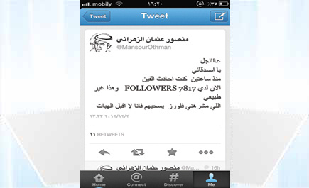 فوجئ الزميل منصور عثمان الزهراني مدير التحرير للشئون المحلية بزيادة عدد متابعيه في موقع التواصل الإجتماعي «تويتر» إلى أكثر من 5.500 متابع خلال أقل من ساعة، حيث كان عدد متابعيه 2.500 فلورز ووصل إلى 7.811 متابعاً. وقال الزميل الزهراني: إنه بينما كان يغرد تارة ويتصفح تارة أخرى موقع التواصل