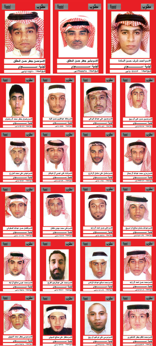 ووزارة الداخلية إذ تعلن ذلك لتهيب بكافة هؤلاء المطلوبين بالمسارعة بتسليم أنفسهم لأقرب مركز شرطة في داخل المملكة أو إلى أيّ من ممثليات المملكة في الخارج لإيضاح حقيقة موقفهم، وسوف يؤخذ ذلك بالاعتبار عند النظر في أمرهم كما تدعو كافة المواطنين إلى المسارعة في الإبلاغ عنهم على الرقم (990) حيث ستصرف مكافآت لمن يقوم بالإبلاغ عنهم، وفي الوقت ذاته فإن وزارة الداخلية تحذر كل من يؤيهم أو يتعامل معهم بأنه سيضع نفسه تحت طائلة المسؤولية عن ذلك.