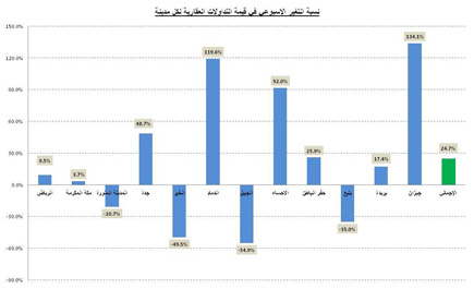 الجزيرة - ناصر البراك: حافظت السوق العقارية في المملكة خلال تعاملاتها الأسبوعية على مستوياتها المرتفعة التي تتداولها منذ قرابة الشهر لتصل خلال الفترة ما بين (9-2-1434) و (13-2-1434) إلى 8.3 مليار ريال مقارنة بـ(6.6) مليار ريال للفترة مابين (2-2-1434) إلى (6-2-1434) وجاء هذا الارتفاع بالدرجة