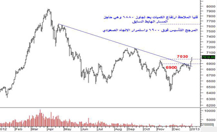 الجزيرة - هشام الوليعي: أنهى سوق الأسهم السعودية تداولات بداية الأسبوع على مستوى 7010.00 نقطة, بارتفاع 70 نقطة تعادل نسبة 1 في المائة, مواصلا السوق ارتفاعه لليوم الثالث على التوالي متجاوزا مستويات قوية على 6900 يوم الأربعاء و 7000 نقطة لجلسة الأمس بتزايد القوة الشرائية وسط تصاعد قيم وأحجام