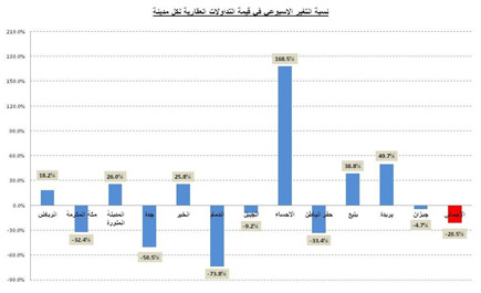 الجزيرة - ناصر البراك: تباين أداء المؤشرات العقارية خلال الأسبوع الماضي في المملكة وذلك خلال الفترة ما بين (16-2-1434) إلى (20-2-1434) حيث تراجعت السيولة العقارية إلى 6.6 مليارات ريال مقارنة بـ 8.3 مليارات ريال للأسبوع الذي سبقه فيما ارتفعت المساحة المتداولة 54.9% لتصل إلى 14.7 مليون متر