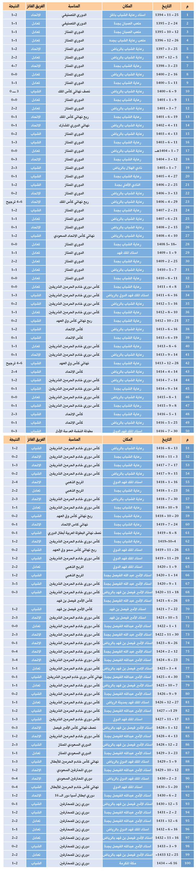 تقابل فريقا الاتحاد والشباب طوال تاريخهما في الرياض في (100) مباراة تمكن الشباب من الفوز في (41) فيما فاز الاتحاد في (27) وتعادلا في (32) وسجل الفريقان طوال تاريخهما (269) هدفاً كان نصيب الشباب (145) هدفا فيما اهتزت الشباك الشبابية بـ (124) هدفاً.. ويعتبر لقاء اليوم النهائي الثامن بين الفريقين حيث سبق وان تقابلا في سبع نهائيات.انتصر الشباب في (5) نهائيات , وانتصر الاتحاد في نهائيين، وسجل الشباب في مرمى الاتحاد في النهائيات (16) هدفا، فيما سجل الاتحاد في مرمى الشباب في النهائيات (8) أهداف. ويعتبر النهائي يوم الثالث في تاريخ المسابقة بين الفريقين.