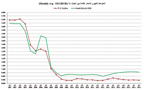 ذلك يعني أن أسعار الفائدة على القروض تتغير بشكل أساسي بناء على أسعار الفائدة على الريال والتي تحددها مؤسسة النقد وبما أن الريال مرتبط بالدولار الأمريكي فأن أي تحرك في أسعار الفائدة على الدولار تستوجب تحرك موازي لأسعار الفائدة على الريال السعودي بحيث يكون هناك هامش بسيط بينهما، حيث يبلغ المتوسط الشهري لأسعار الفائدة بين البنوك (Monthly Avg. 3M SIBOR) في نهاية الربع الثاني مع هذا العام 0.95% للريال السعودي بينما يبلغ 0.26% على الدولار الأمريكي، ويوضح الرسم البياني الحركة التاريخية لأسعار الفائدة على الريال السعودي والدولار الأمريكي حيث كانت أسعار الفائدة تصل إلى أكثر من 5% في عام 2007 إلى أن وصلت إلى أقل من 1% منذ الربع الثاني من عام 2009 إلى الوقت الحاضر. وبالنظر إلى الاقتصاد الأمريكي فإن الانتعاش الهش فيه والنمو الضعيف المتوقع تحقيقه خلال هذا العام يمنع السلطات الأميركية من رفع معدل الفائدة بشكل قوي، حيث صرح رئيس مجلس الاحتياطي الفيدرالي الأميركي بن برنانكي مؤخراً بأنه سيدرس رفع سعر الفائدة على الدولار الأميركي حال تسجيل تغير إيجابي في معدلات البطالة، أي أن لاشيء يدل على تغير متوقع قبل النصف الثاني من عام 2014، وربما يستمر هذا الوضع حتى عام 2015، إلا أنه وبكل تأكيد لن يبقى كذلك على المدى المتوسط. وفي ظل الانتعاش الكبير الذي يشهده الاقتصاد السعودي بشكل عام والسوق العقاري بشكل خاص فإن الملاحظ لهيكل الائتمان يلاحظ ارتفاع التمويل العقاري في المملكة من 13.4 مليار ريال في نهاية الربع الأول من عام 2007 حيث كان يشكل 7.6% من إجمالي القروض الاستهلاكية وبلغ ا 38.4 مليار ريال في نهاية الربع الأول من عام 2013، مشكلا 12.5% من إجمالي القروض الاستهلاكية، هذا الارتفاع الكبير في القروض العقارية هو بلا شك أحد عوامل ارتفاع أسعار العقارات بالمملكة والتي تشهد في ظل الفجوة بين الطلب والعرض في المساكن مضاربات حامية مستغلة نقص قنوات الاستثمار وارتفاع منسوب السيولة وزيادة معدلات التضخم. إذاً بما أن أسعار الفائدة على القروض العقارية (وجميعها قروض طويلة الآجل) ما زالت عند مستويات منخفضة مقارنة بأسعارها التاريخية فان أي تحرك في أسعار الفائدة على القروض والذي بالطبع سوف يكون للأعلى فإن أصحاب القروض العقارية التي تكون فيها أسعار الفائدة متغيرة سيكونون أكثر عرضة للمخاطر من أولئك الذين حصلوا عليهابتكلفة ثابتة، وبغض النظر عن التغير في أسعار العقارات سواء في الانخفاض أو الارتفاع فإن البنوك يجب أن تكون أكثر وضوحا مع عملائها في بيان تلك المخاطر التي قد يتعرض لها العميل من حيث التغير في أسعار الفائدة.