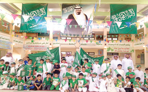 شقراء - محمد الحميضي / تصوير - غازي المقاطي: احتفلت مدرسة علي بن أبي طالب الابتدائية بشقراء باليوم الوطني بعد أن توشحت المدرسة باللون الأخضر ورفرفت الأعلام في كل مكان من المدرسة وتزينت بحلل خضراء أعدها مدير المدرسة مزروع المزروع وأعضاء هيئة التدريس بالمدرسة والمرشد الطلابي ورائد النشاط؛
