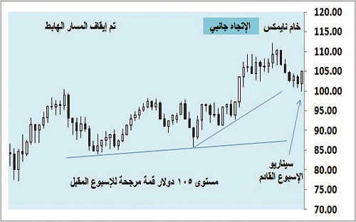 أنهى خام نايمكس أسبوعه عند مستوى 101.75 دولار وبنمط بيعي لامس فيه الحاجز النفسي 100 دولار تكملة للمسار الهابط الذي بدأ من 112 دولار وهذا الأسبوع تمكن تجاره من وقف المسار الهابط والدخول في حيرة قد تخدم موقف المشترين والمتحوطين أكثر هذه الأيام، ويظهر أن المتحوطين بانتظار نظرة استشرافية حول الدولار بخصم أثر الدين والتضخم ليتمكنوا من تحديد مساحة التحوط القادمة في أوعيتهم الاستثمارية.