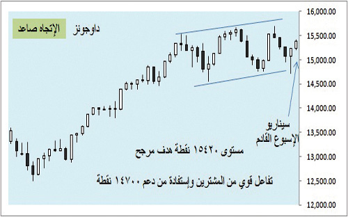ارتفاع تدريجي بدأ من قاع الأسبوع 14719 نقطة وانتهى عند أعلى مستوى للأسبوع ذاته وهو مستوى 15237 نقطة أي بنمط شرائي قوي أوقف المسار الهابط .
