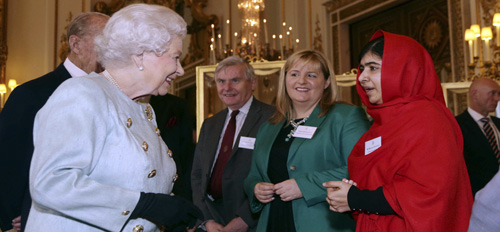 - ملكةُ بريطانيا (إليزابيث) تتكلم مَع مالالا يوسف زاي أثناء استقبال لشاب، تعليم والكومنولث في قصر بكنغهام في لندن، وكانت مالالا قد تعرّضت لإطلاق النار في الرأس على أيدي حركة طالبان لمطالبتها بتعليم الفتيات ... رويترز