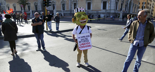 - متظاهر يلبس قناعاً لتمثيل رئيس الوزراء الإيطالي السابقِ سيلفيو بيرلسكوني احتجاجاً على الحكومةِ في مدينةِ روما وما تقوم به من أفعال بفرض مزيد من الضرائب وتجميد لرواتب القطاع العام .... رويترز