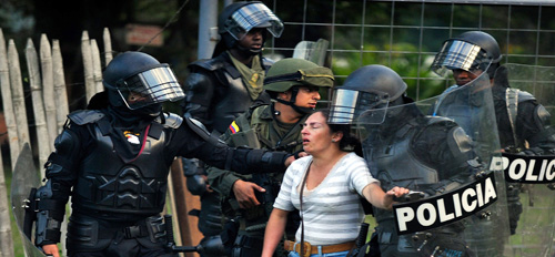 - شرطة الاضطراباتِ الكولمبيين يُساعدونَ امرأة تأثرت بالغاز المسيّل للدموعِ أثناء اشتباكات مَع المتظاهرين ... أ ف ب