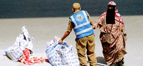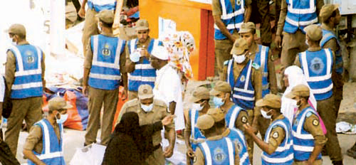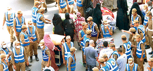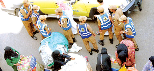 عدسة «الجزيرة» رصدت أمن المشاة فيما يتعلق بالقضاء على العشوائية والافتراش من قبل بعض البائعات اللاتي يفترشن بضائعهن في طرقات وشوارع مشعر منى، وكان تعامل الأمن مع هؤلاء البائعات بصورة حضارية وفي أحيان أخرى تجد رجل الأمن يساعدهن على حمل بضائعن ليرحلن عن الأمكان التي تضايق الحجاج.
