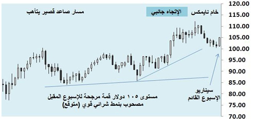 خام نايمكس لم يستفد مما حدث في أمريكا إلا من زاوية واحدة، حيث تمكن من كبت المسار الهابط والدخول في حيرة وتجهيز مسار صاعد قصير، وذلك بعد ما تمكن من تأسيس دعم جيد عند الحاجز النفسي 100 دولار، ونرجح أن يبدأ مسارٌ صاعد على مستوى الحركة الأسبوعية يستهدف مستوى 105 دولارات وإنهاء الأسبوع عنده بنمط شرائي جيد، وذلك بعد ظهور بوادر ضعف في العملة الخضراء أمام معظم العملات الرئيسة وعملات السلع.