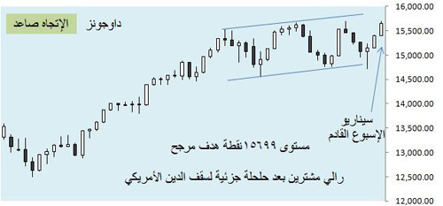 بدأ الأسبوع برالي مشترين لم يتوقف إلا عند مستوى 15409 نقاط انتهى بنمط شرائي قوي عزز من المسار الصاعد على مستوى الحركة الأسبوعية.. جاء ذلك بعد الموافقة على سقف الدين الأمريكي والذي مدد إلى فبراير القادم، لكن لا تزال الحيرة مسيطرة على بارومتر الأسواق (داوجونز) على المدى المتوسط والطويل، كما هو موضح على الرسم البياني ونتوقع قمة جديدة الأسبوع المقبل عند 15699 نقطة وبنمط شرائي أقوى.