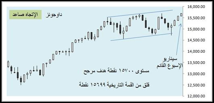 استمر داوجونز بالصعود المتدرج هذا الأسبوع انتهى بنمط شرائي أضعف من الأسبوع الماضي نتيجة قربه من القمة التاريخية 15700 نقطة تقريباً وداخل منطقة الحيرة العظمى على المدى المتوسط، وعزز أداء الداوجونز ضعف الدولار والتوجه للأصول ذات المخاطر العالية وأبرزها الأسهم، ونرجح الأسبوع المقبل أن يقوم بمحاولة لتسجيل قمة تاريخية جديدة فوق الحاجز 15700 نقطة لكن بنمط شرائي أضعف من الأسبوع الماضي.