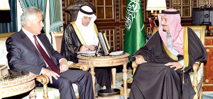 استقبل صاحب السمو الملكي الأمير سلمان بن عبدالعزيز آل سعود ولي العهد نائب رئيس مجلس الوزراء وزير الدفاع في قصر سموه بالرياض مساء امس معالي وزير الدفاع الأمريكي تشيك هيجل والوفد المرافق له. وجرى خلال الاستقبال استعراض علاقات التعاون بين البلدين الصديقين وسبل دعمها وتعزيزها بالإضافة إلى آخر المستجدات على الساحتين الإقليمية والدولية. حضر الاستقبال من الجانب السعودي صاحب السمو الملكي الأمير سلمان بن سلطان بن عبدالعزيز نائب وزير الدفاع وصاحب السمو الملكي الأمير محمد بن سلمان بن عبدالعزيز رئيس ديوان سمو ولي العهد المستشار الخاص لسموه، ومعالي سفير خادم الحرمين الشريفين لدى الولايات المتحدة الأمريكية الأستاذ عادل الجبير، ومعالي نائب رئيس هيئة الأركان العامة الفريق عبدالرحمن بن صالح البنيان، ومعالي قائد القوات الجوية الفريق الركن فياض بن حامد الرويلي، ونائب قائد قوات الدفاع الجوي اللواء مزيد العمرو، والملحق العسكري السعودي في واشنطن اللواء أحمد القحطاني، ومدير عام مكتب سمو وزير الدفاع المكلف اللواء صقر بن محمد العمري. ومن الجانب الأمريكي القائم بأعمال السفارة تيموثي ليندر كينغ، وكبير رئيس الموظفين مارك ليبرت، وكبير المساعدين العسكريين روبرت أبرامس، ومسئول شئون الأمن الدولي ديريك كوليت، ومساعد شئون الأمن الدولي لمنطقة الشرق الأوسط ماتسبينس.