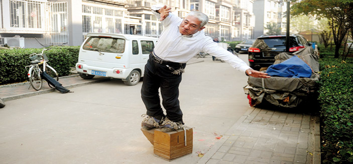 ينتعل عامل صيني زوجا من الأحذية يبلغ وزن كل منهما 200 كيلوغرام، ليشارك بهما في مسابقة للمشي بالأوزان تلقى رواجا في الصين.