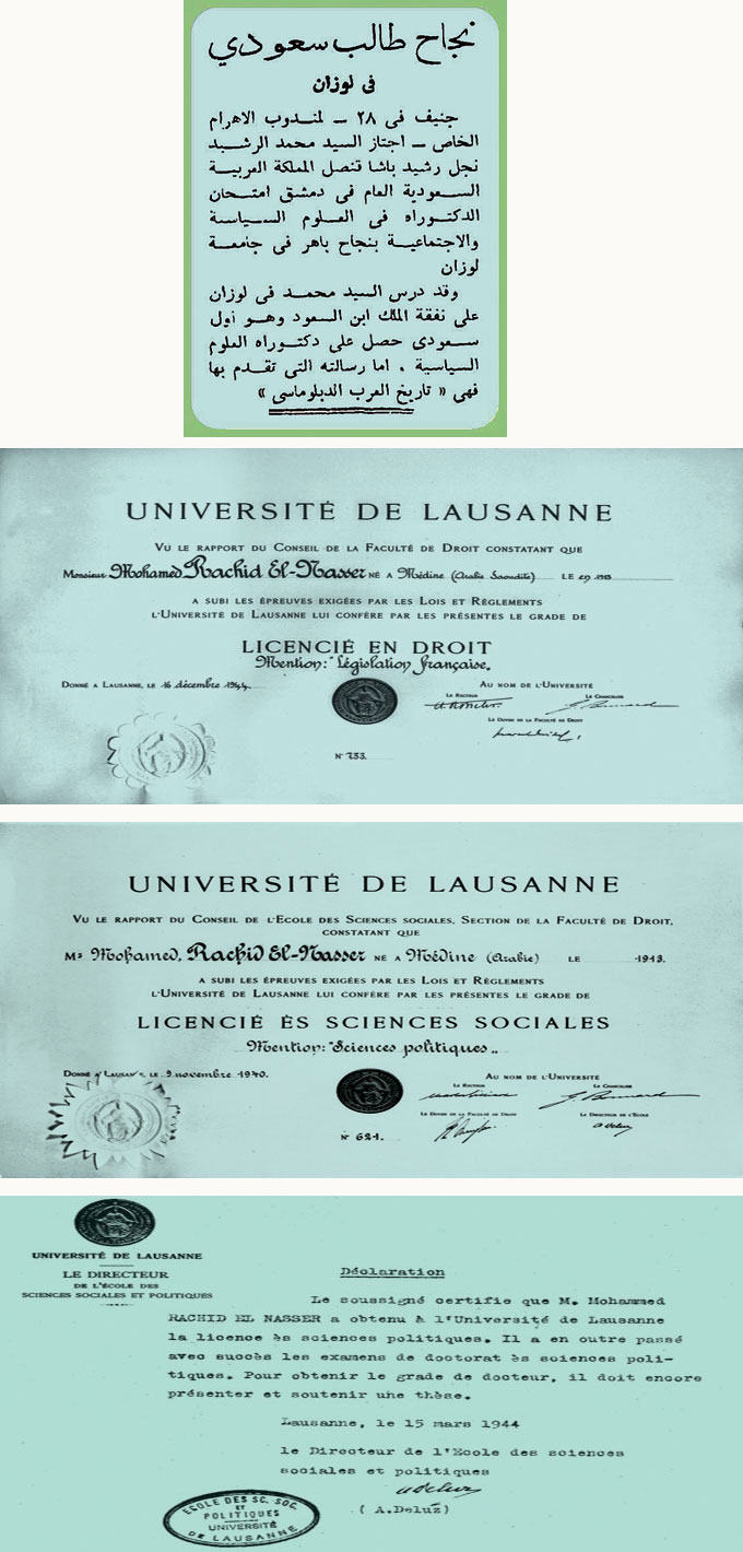 وقد ذكر الدكتور سعيد السريحي أن أول من حصل على درجة الدكتوراه في المملكة هو العم محمد الرشيد الناصر عام 1356هـ في العلوم السياسية من جامعة لوزان ورسالته للدكتوراه كانت بعنوان (التاريخ السياسي للعرب)، وهو ما أشار إليه الأستاذ عبدالكريم الجهيمان بجريدة القصيم في العدد (58) الصادر في 30 رجب 1380هـ ، مستشهداً في ذلك بما نشرته جريدة (صوت الحجاز) في عددها (528) الصادر يوم الأحد 2 ذي القعدة 1359هـ، الموافق 2 ديسمبر 1940م، تقول في الصفحة الثالثة «نجاح طالب سعودي، نشرت جريدة الأهرام الغراء في عددها الصادر بتاريخ 28 رمضان سنة 59، لمراسلها الخاص في جنيف هذه الكلمة، « اجتاز السيد محمد الرشيد، نجل رشيد باشا قنصل المملكة العربية السعودية العام في دمشق، امتحان الدكتوراه في العلوم السياسية والاجتماعية بنجاح باهر في جامعة لوزان، وقد درس السيد محمد في لوزان على نفقة جلالة الملك ابن السعود، وهو أول سعودي حصل على دكتوراه العلوم السياسية، أما رسالته التي تقدم بها فهي ـ تاريخ العرب الدبلوماسي ـ» وهو ما ذكره الأستاذ محمد بن عبدالرزاق القشعمي في مقال نشرته جريدة عكاظ الأسبوعية في عددها رقم 2812 الصادر بتاريخ 02 /03 /1430هـ الموافق 27/ 2 /2009م.